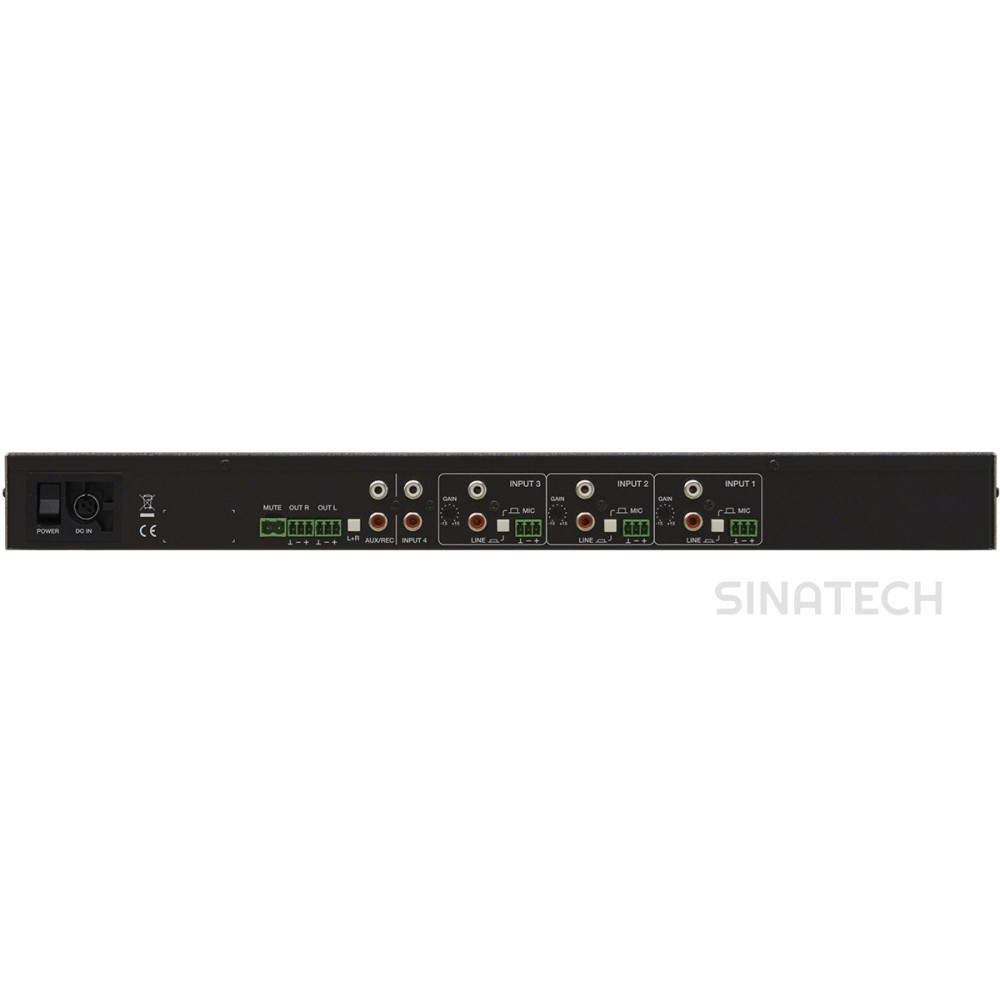| Масса 1,7 кг | Потребляемая мощность 14 Вт | Входы 6 – микрофонный: балансное аудиомоно, клеммный блок 7 – линейный: аудиостерео, разъемы 2xRCA (розетка) 1 – замыкаемые контакты mute, клеммный блок |