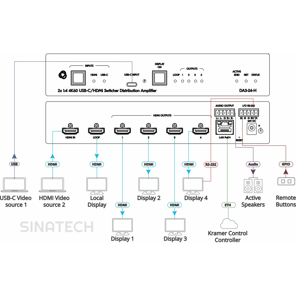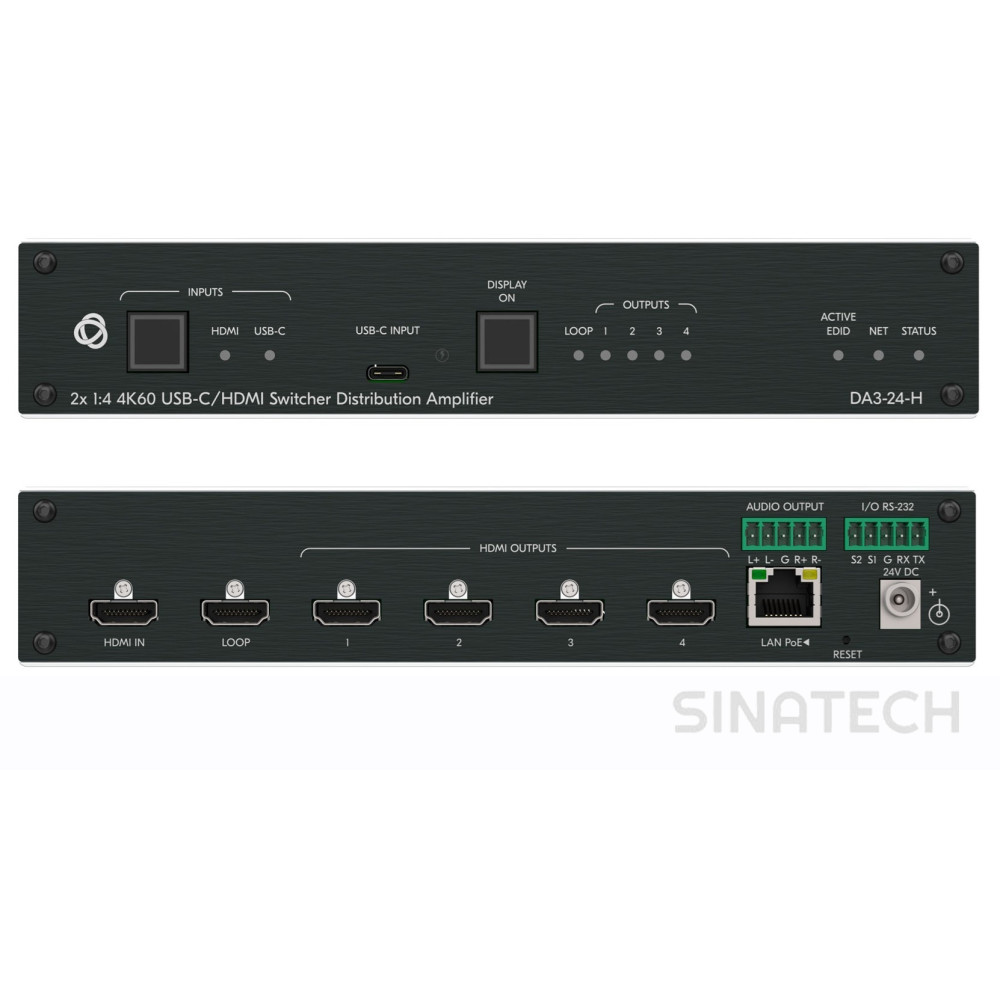 Kramer DA3-24-H Усилитель-распределитель 1:4 HDMI с коммутатором 2х1 HDMI + USB-C и деэмбедером аудио