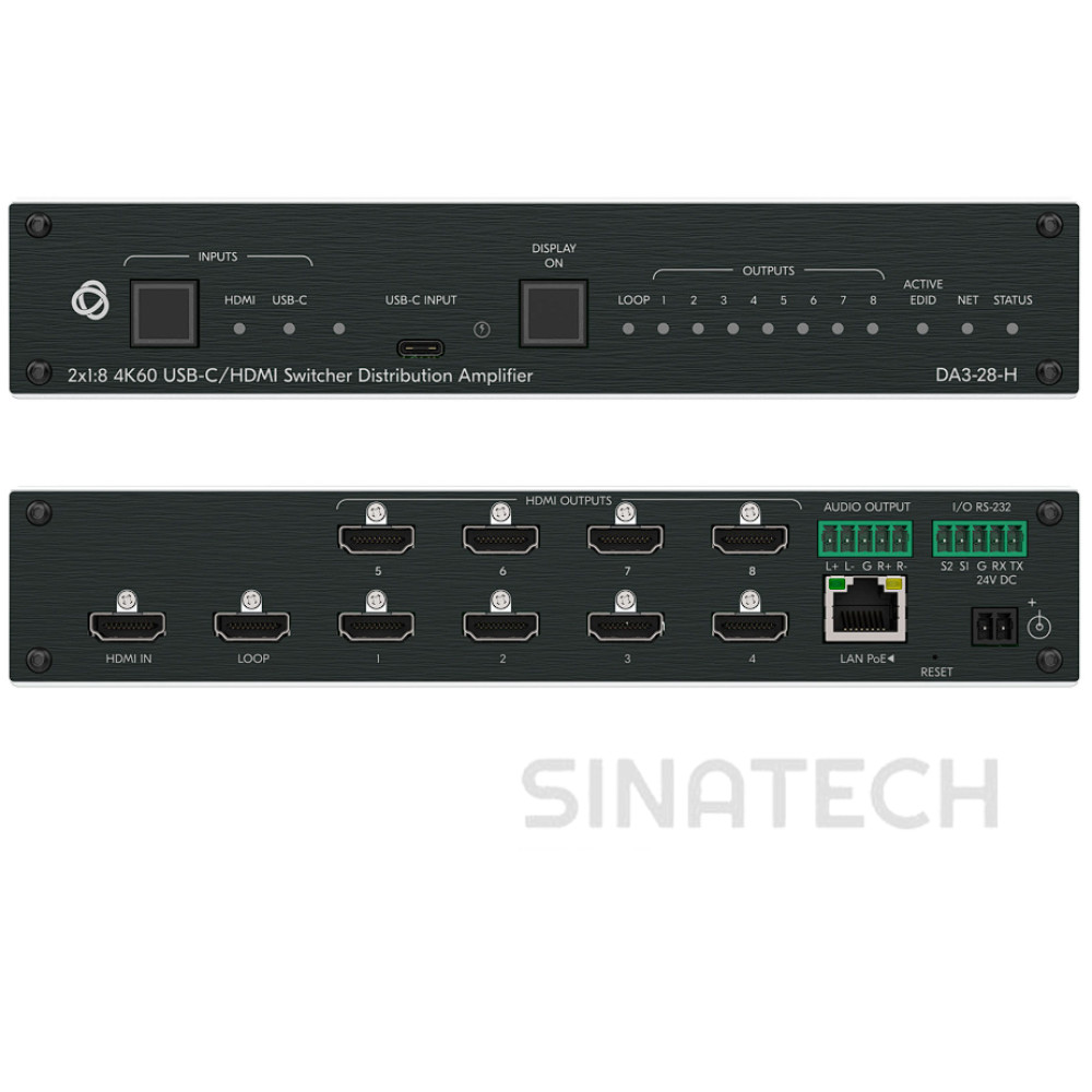 Kramer DA3-28-H Усилитель-распределитель 1:8 HDMI с коммутатором 2х1 HDMI + USB-C и деэмбедером аудио