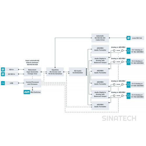 Mini Converter SDI to Audio предназначен для вывода 4-х каналов симметричного аналогового или 8-и каналов цифрового AES/EBU звука из видеосигнала формата SDI включая 1080p/60 и 2K. Использование конвертера возможно в самых разных местах, от студий и мобильных установок до спортивных стадионов и других открытых площадок. Благодаря простому и компактному дизайну он исключительно надежен и подходят для эксплуатации в круглосуточном режиме.