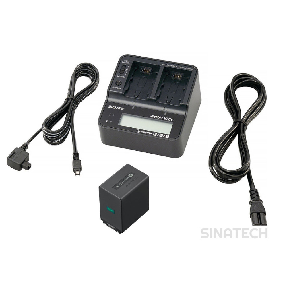SONY ACC-V1BPA комплект из портативного зарядного устройства AC-VQV10 для двух аккумуляторов SONY “InfoLITHIUM” серий V/H/P и аккумулятора NP-FV100A InfoLITHIUM®. Состояние заряда аккумуляторов отображается на светодиодном индикаторе. Заряд аккумуляторв последовательный, AC-VQV10 автоматически начинает заряд второго аккумулятора после завершения цикла заряда первого.