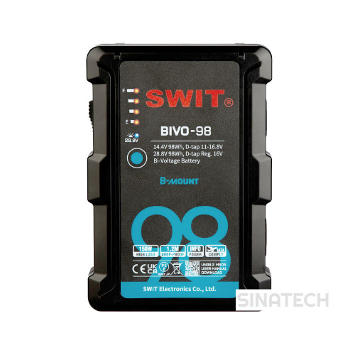 SWIT BIVO-98 аккумуляторная батарея серии Bi-voltage с креплением B-mount - отраслевого стандарта одобренного компанией ARRI. Аккумулятор распознает значение резистора идентификационного контакта площадки B-mount и затем выдает напряжение 14,4 В или 28,8 В без какого-либо риска неправильного использования. Имеет надежную систему фиксации на камерной площадке, защиту от перегрузки и выдерживает падение с высоты 1,2 метра.