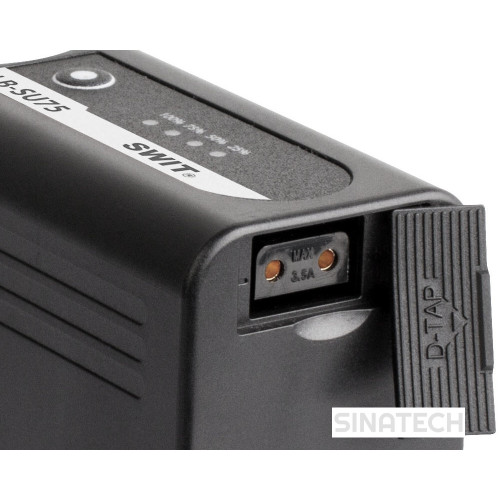 В верхней торцевой части аккумулятора LB-SU75 расположен разъем D-tap с выходным напряжением 14.4В (номинальное). Вы можете подключить накамерный светодиодный светильник, контрольный монитор или систему беспроводной передачи видео. Максимальная выходная мощность на контактах разъема 50Вт/4А. Кроме этого, D-tap разъем может использоваться совместно с портативным зарядным устройством SWIT PC-U130B/B2 для заряда элементов аккумулятора.