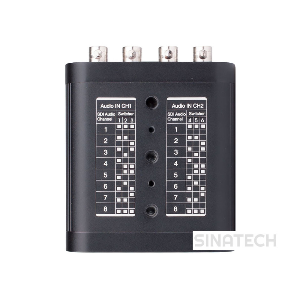 SWIT S-4610 предназначен для ввода двух каналов симметричного аналогового или цифрового AES/EBU звука в видеосигнал формата SDI. Выбор назначаемого канала (1-8) производится переключателями на лицевой стороне блока. Таблица положений переключателей расположена на обратной стороне S-4610. В комплект поставки входит адаптер питания 220/12В и монтажная пластина с набором крепежных винтов.